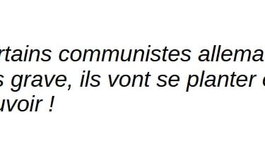 La défaite de 1918 entraîne la chute de l'empire allemand et la mise en place d'une démocratie libérale. Les communistes allemands sont les plus avancés d'Europe, tant sur le plan de l'organisation que de la réflexion politique. Certains se rallient au réformisme. Pour les plus radicaux (les Spartakistes conduits par Karl Liebknecht et Rosa Luxemburg). La question du déclenchement d'une révolution prolétarienne se pose. Le gouvernement bourgeois fait appel de façon plus ou moins officieuse aux Corps Francs, unité d'élite de l'armée allemande durant la guerre pour réprimer le mouvement. Rosa Luxemburg et Karl Liebknecht sont battus à mort en janvier 1919.